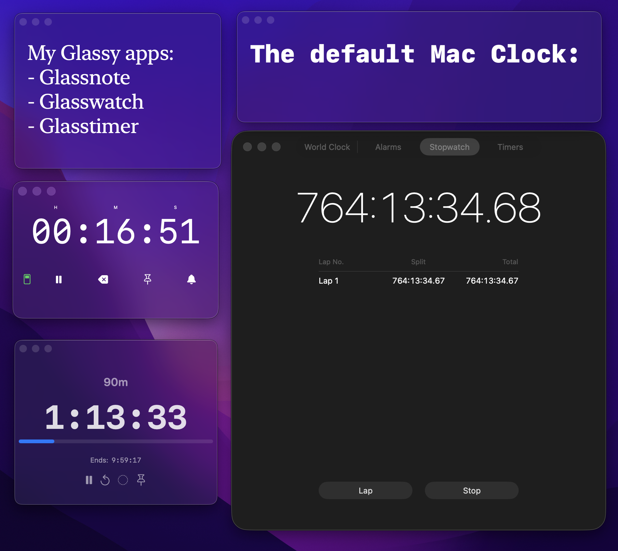 ✅ Customizable windows – Resize and arrange as you like, with no minimum window size. Calling you out, default Mac stopwatch: